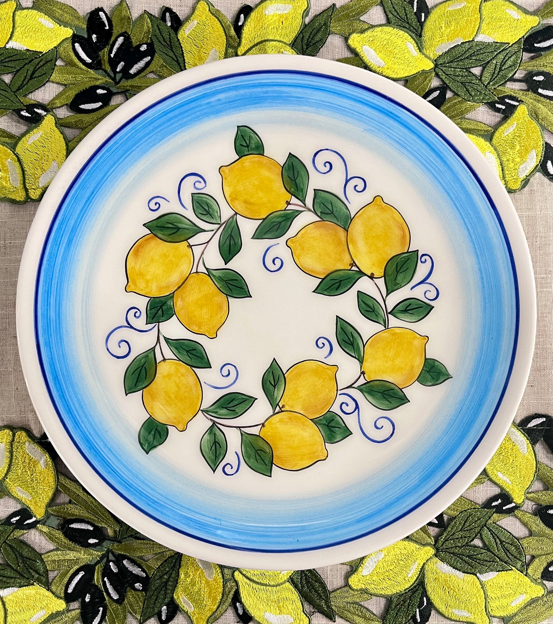 -Round ceramic platter in a lemons and blue design from Sofia’s Athens workshop.